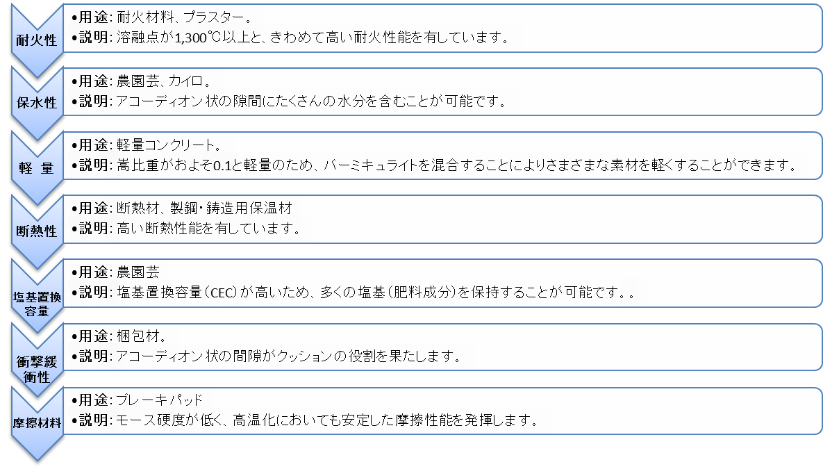 バーミキュライトはSiO2、MgO、Al2O3を主成分とするケイ酸塩鉱物です。高温(約1000℃)で加熱すると10倍以上膨張する性質を持ち(この状態を焼成バーミキュライトと呼びます。)、保水性や耐火性、断熱性、軽量等に優れています。そのため、この特性を生かした活用が建築材・農園芸・鉄鋼の保温材他様々な分野で使用されています。