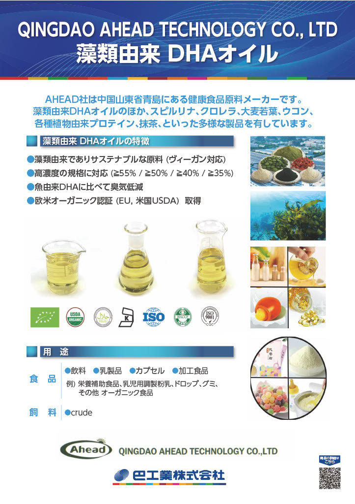 AHEAD社は中国 山東省青島にある健康食品原料のメーカーです。藻類由来DHAオイルのほか、スピルリナ、クロレラ、大麦若葉、ウコン、各種植物由来プロテイン、抹茶、といった多様な製品を有しています。