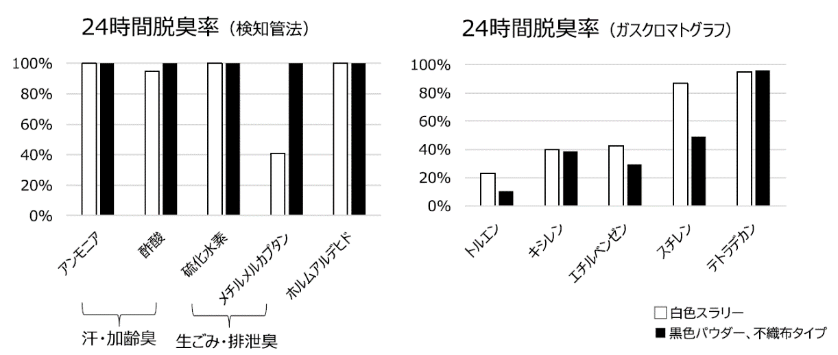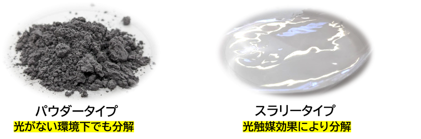 ・黒色パウダータイプ(光がない環境下でも吸収分解)・白色スラリータイプ(光触媒効果で吸収分解)