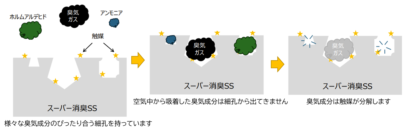 化学吸着と物理吸着の相乗効果により、「汗・加齢臭」「生ごみ・排泄臭」「有機溶剤臭」など原因成分を吸着分解します。