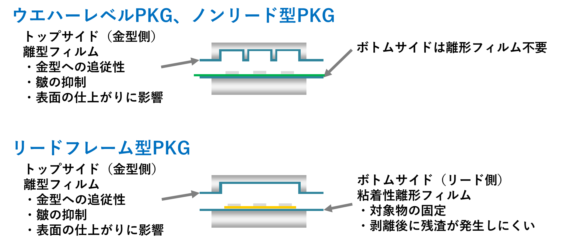 ボールグリッドアレイ基板(BGA)やウェハーレベルパッケージ(WLP)、パネルレベルパッケージ(PLP)などの次世代実装工程で使用される離型フィルムから、QFN、DFNなどのCSP(Chip Scale Package)のマップモールドに使用される離型フィルムまで広く取り揃えております。